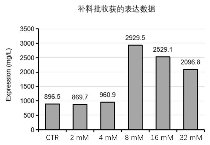 此前,并無高效表達(dá)人類神經(jīng)生長因子(human never growth factor,hNGF)的培養(yǎng)方法,極大限制了 hNGF 的大規(guī)模生產(chǎn)和在臨床與藥物方面的應(yīng)用。漢騰生物采用補(bǔ)料分批培養(yǎng)方法,并發(fā)現(xiàn)了新的添加劑,可以將 hNGF 重組蛋白的表達(dá)量提高至少 100%,產(chǎn)量最高可提升至 2900 mg/L左右(圖 2),較大地提升了 hNGF 在 CHO 細(xì)胞中的表達(dá)水平(詳細(xì)內(nèi)容參考漢騰專利:重組神經(jīng)生長因子的高效表達(dá)方法,CN2023108028220)。