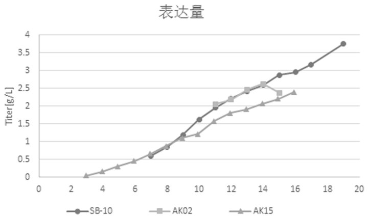 圖 4. 蛋白表達(dá)量。SB-10:環(huán)軌搖晃式生物反應(yīng)器;AK02:3 L攪拌式生物反應(yīng)器;AK15:15 L攪拌式生物反應(yīng)器